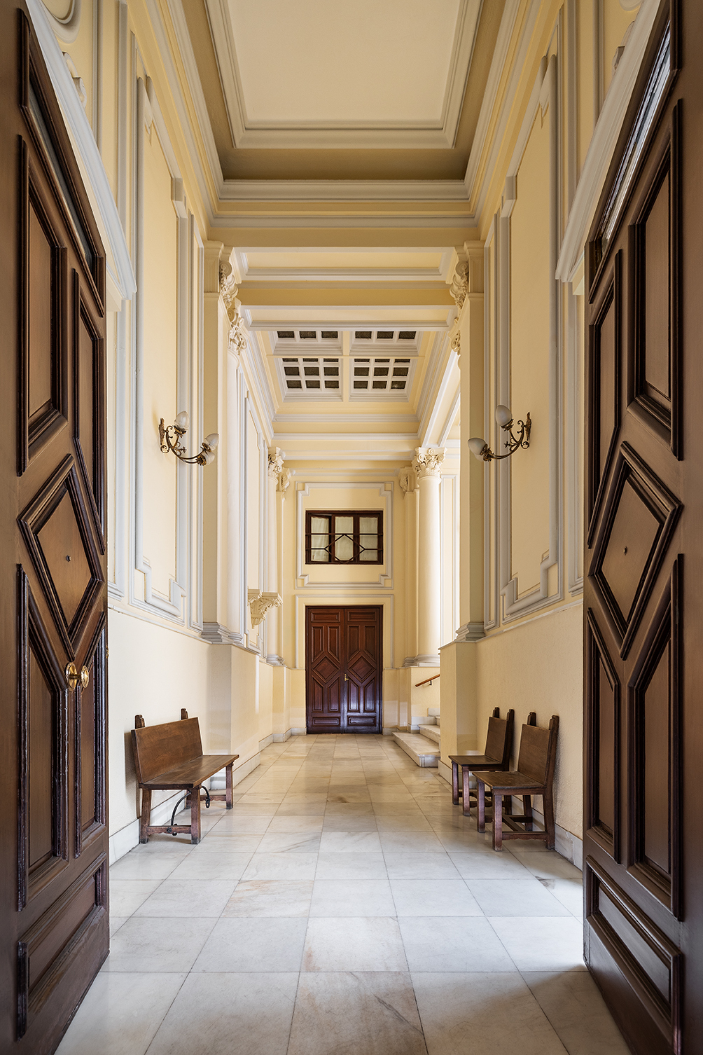 Desde este paso se alcanzaba el vestíbulo y la escalera principal del palacio, dispuestos al estilo clásico, con solado y escalinata de mármol blanco, columnas exentas y molduras decorativas.