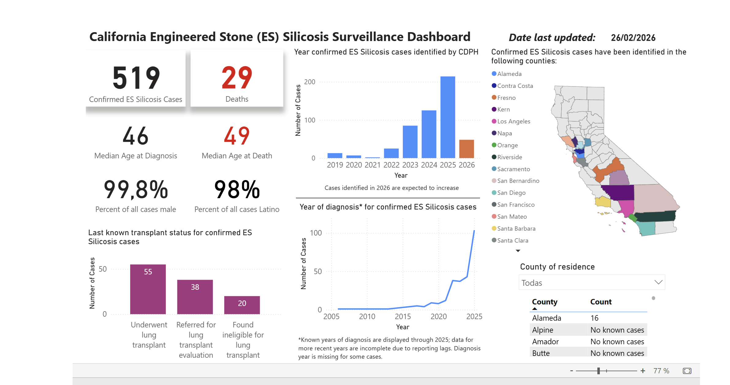 Fuente: California Engineered Stone Silicosis Surveillance Dashboard, Departamento de Salud Pública de California. Datos actualizados a 26/02/2026.