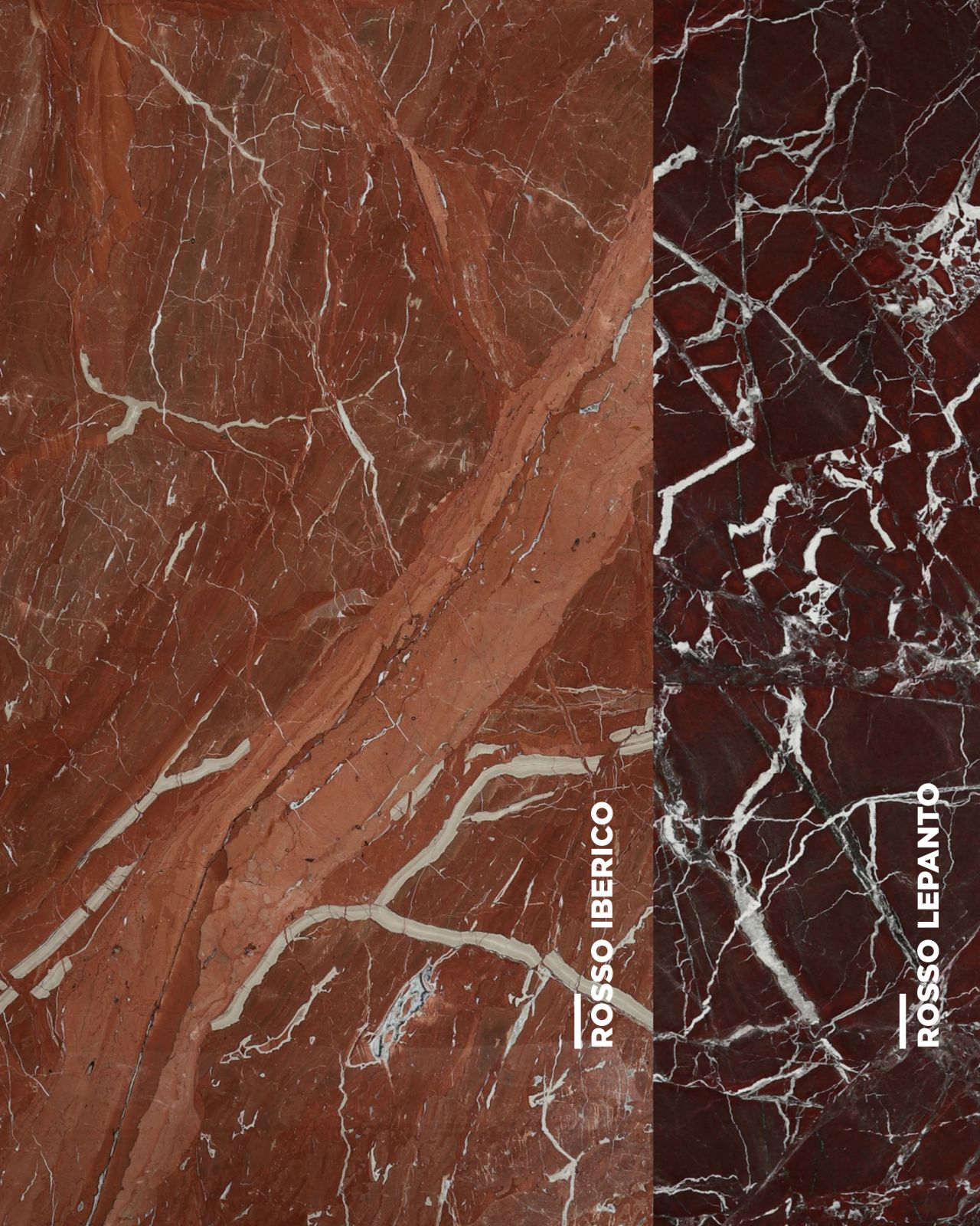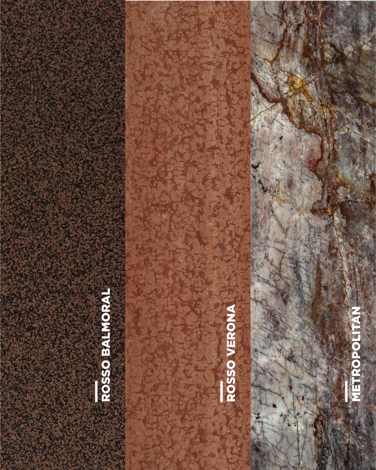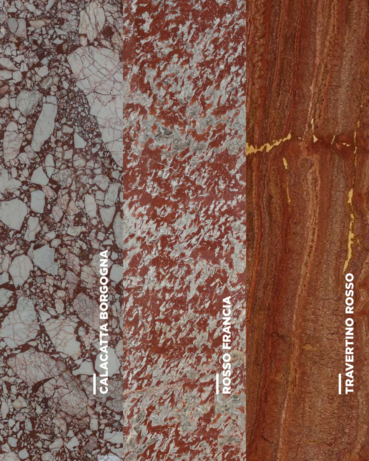 Los materiales elegidos para esta colección son: Rosa Balmoral, Rosso Verona, Metropolitan, Calacatta Borgogna, Rosso Francia y Travertino Rosso.