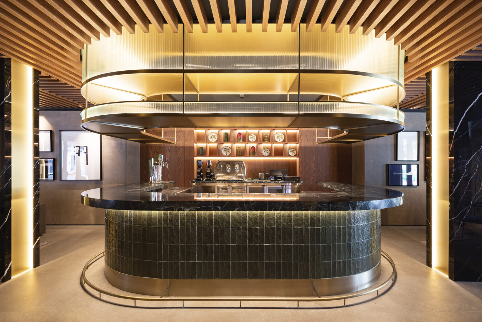 La barra central, realizada en cerámica y latón, se erige como el eje vertebrador del restaurante, estableciendo una transición fluida entre el lobby del hotel y el espacio gastronómico. En torno a la barra, la distribución se organiza mediante bancadas semicirculares de módulos de madera, en las que se incorporan elementos vegetales que aportan privacidad, frescura y un guiño a la naturaleza.