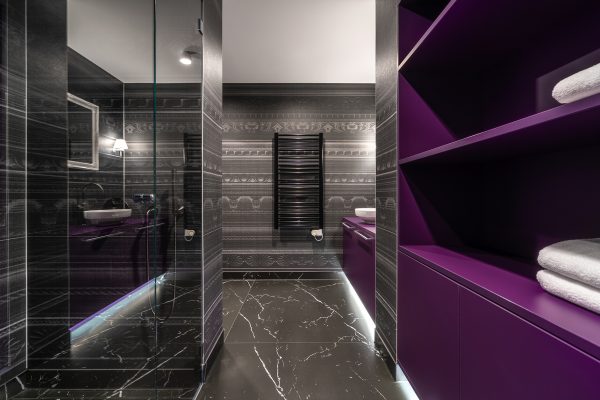 La primera habitación, la Suite “Blueberry”, tiene los suelos del baño revestidos en Neolith® Nero Marquina. Este modelo monocromático y marmóreo crea un acogedor conjunto decorativo y complementa a la perfección el intenso morado de las encimeras y las estanterías.