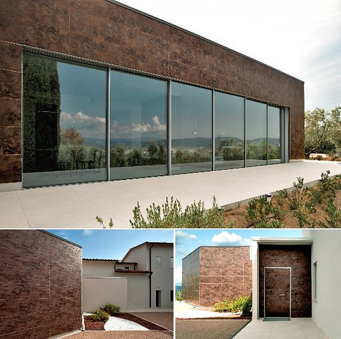 El exterior de la casa, inmerso en el exuberante verde de las colinas toscanas, combina una estructura tradicional con soluciones modernas, empleadas para revestir parte de la fachada y las puertas exteriores. El óxido, seleccionado con el acabado Moro, muestra la tridimensionalidad de la superficie que ofrece esta textura de efecto metálico oxidado cuando reacciona a la luz solar.