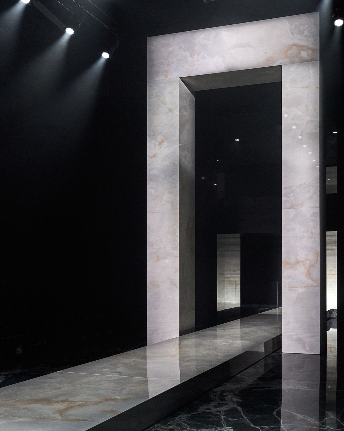 La elección del color se centró en el intenso negro absoluto de Uni Pepper, el ahumado degradado de Majestic Onyx (ambas superficies Fiandre ) y las vetas doradas de Ariostea Onice Grigio. El acabado pulido realzó los reflejos dinámicos, la luz y los movimientos, creando un marco elegante e impactante que realza la sastrería de alta costura de las prendas.