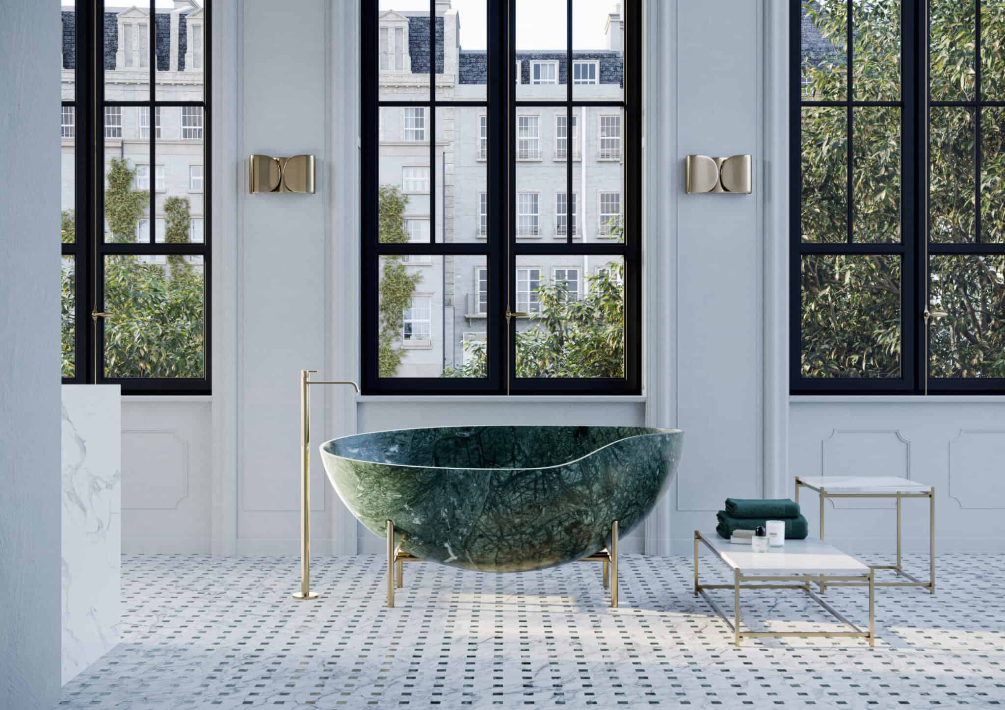 Kora es uno de los modelos de bañeras fabricadas en piedra natural de la firma italiana Kreoo que marca un encuentro armonioso entre perfiles y geometrías fluidas, entre peso y ligereza, entre mármol y metal: la bañera de acceso libre diseñada por Enzo Berti está revestida en un solo bloque, con un perfil superior de diferentes alturas que facilita el acceso y ofrece un resultado muy elegante.