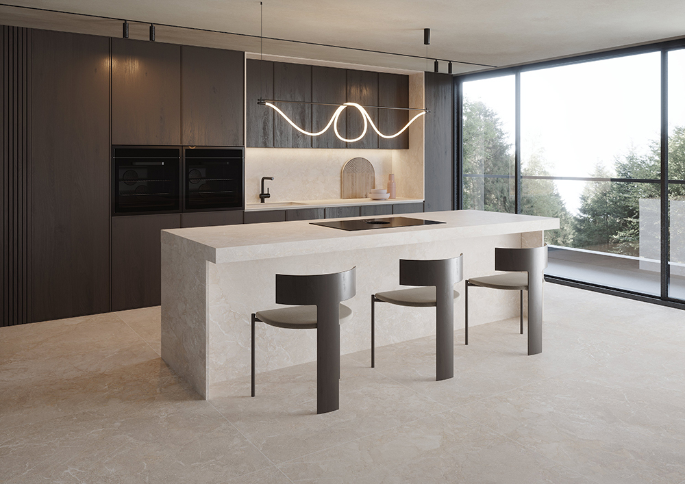 En este contexto se sitúa la encimera porcelánica Serene de Museum Surfaces, una propuesta que interpreta la monomaterialidad desde la calma. Su gráfica sutil y su tonalidad Sand, de carácter cálido y natural, permiten una aplicación continua del material sin saturar el espacio, favoreciendo una atmósfera de serenidad y elegancia silenciosa.