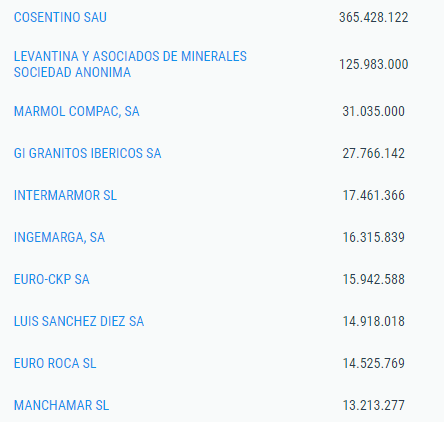 Las empresas de corte, tallado y acabado de la piedra que mejores cifras hicieron en el anterior ejercicio fueron Cosentino que facturó 365.428.122 euros encabezando este ranking y doblando de lejos los ingresos de la segunda en el ranking que fue Levantina y Asociados de Minerales que registró 125.983.000 euros. Cosentino ocupa la posición 361 en facturación a nivel nacional y mejoró su posicionamiento respecto al 2014. Levantina por su parte ocupa la posición 1.055 a nivel nacional.
