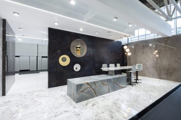 La distribución de la superficie permite conocer las principales novedades de la firma en sus tres espacios abiertos y conectados entre sí; recepción, cafetería y salas de reuniones. Las nuevas colecciones de inspiración metal como Steel Stripe Brown reviste, junto a Astana Grey, la fachada principal del stand.