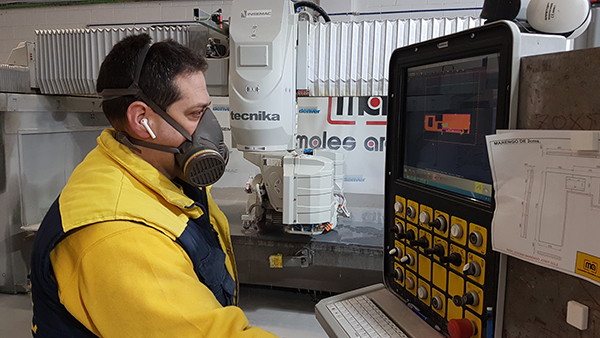 Contamos con un disco puente 5 ejes de la marca Denver comercializado por Insemac, con un centro de mecanizado Intermac, y varias máquinas neumáticas de corte y pulido con agua. No trabajamos en seco. La salud de los trabajadores y el acabado son importantes en nuestra empresa.