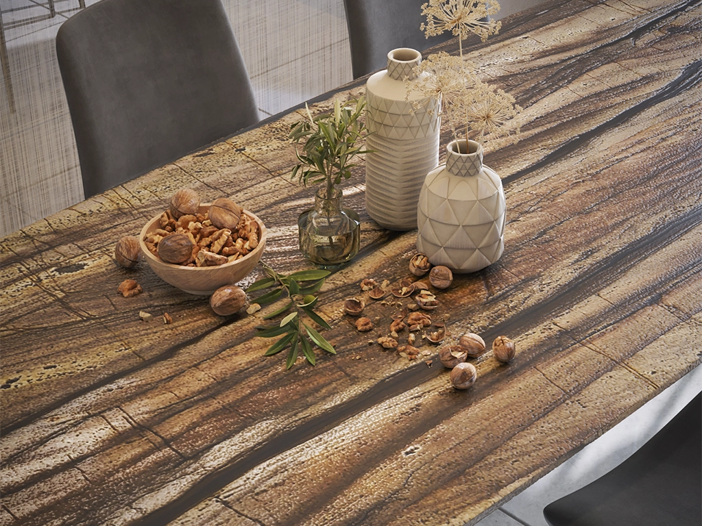 Con una sólida reputación en el mercado, la cuarcita Sandalus ahora pertenece a la cantera de la firma brasileña Magban. El nuevo frente de cantera presenta una estructura consolidada, lo que permite un acabado pulido además del tradicional cepillado. Sandalus es una cuarcita de grano fino con una foliación marcada por la deposición y la orientación de sus minerales, presentando variaciones de color en tonos más oscuros y marrones.